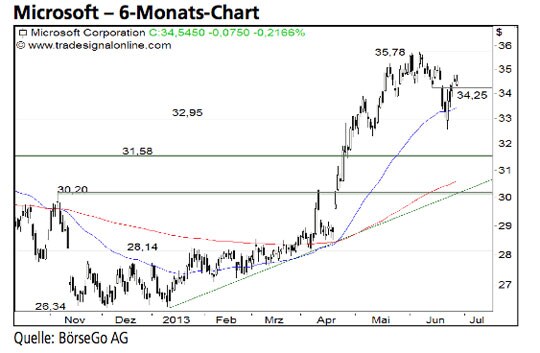 Der Kaufimpuls, der nach dem erfolgreichen Rück- lauf an die 32,95 USD-Marke einsetzte, spricht aus unserer Sicht dafür, dass die Bullen die Aktien von Microsoft wieder fest in ihrer Hand haben. Ein Ausbruchsversuch über das der- zeitige Rallyhoch dürfte in Kürze folgen. Die Long-Szenarien: Verbleibt der Wert oberhalb von 34,25 USD, dürfte es zu einem Anstieg bis 35,78 USD kommen. An dieser Stelle könnte zunächst eine weitere Korrektur einsetzen. Gelingt im Anschluss ein nachhaltiger Ausbruch über die Barriere, wäre ein erneutes Kaufsignal mit einem ersten Ziel bei 37,50 USD gebildet. Auf mittlere Sicht könnte der Wert oberhalb dieser Hürde bereits bis 41,30 USD und schliesslich sogar bis 48,00 USD haussieren. Die Short-Szenarien: Setzen die Aktien dagegen im weiteren Verlauf unter die Haltemarke bei 34,25 USD zurück, dürfte es ausgehend von 32,95 USD zu einem weiteren Ausbruchsversuch über das Jahreshoch kommen. Ein Bruch dieser Unterstützung hätte dagegen eine leichte Ausweitung der Korrektur bis 31,58 USD zur Folge. Doch auch an dieser Stelle könnte eine Stabilisierung einsetzen. Erst darunter würde eine deutliche Gegenbewegung bis 30,20 USD führen.