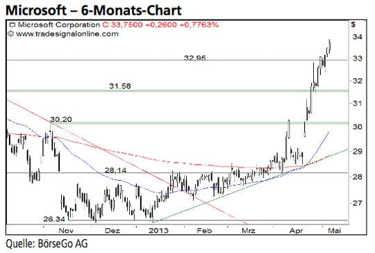 Der Aufwärtsimpuls, der bei den Aktien von Microsoft in den letzten Wochen vorherrscht, ist an Dynamik und Steilheit kaum mehr zu überbieten. Eine korrektive Gegenbewegung wird damit zusehends wahrscheinlicher. Die Long- Szenarien: Kurzfristig könnte der Wert weiter bis 33,80 und 34,50 USD haussieren, ehe an dieser Stelle mit einer Korrektur bis 32,95 USD zu rechnen wäre. Doch selbst ein etwas stärkerer Rückgang auf 31,58 USD würde den bullishen Ausblick nicht eintrüben. Ein anschliessender Ausbruch über 33,80 USD würde eine weitere Kaufwelle bis 37,50 USD nach sich ziehen. Sollte auch diese massive Barriere überwunden werden, könnten die Aktien auf mittlere Sicht bereits bis 41,30 USD ansteigen. Die Short-Szenarien: Erst ein Ausverkauf unter 31,58 USD auf Tagesschlusskursbasis würde derzeit für eine ausgeprägte Korrektur sprechen. In diesem Fall wären Verluste bis 30,20 USD wahrscheinlich, ehe der Wert von dort aus wieder in Richtung 32,95 USD drehen dürfte. Ein Bruch der 30,20 USD-Marke würde den Anstieg jedoch neutralisieren und ein Verkaufssignal auslösen. Auf mittlere Sicht könnte es in der Folge zu einem Ausverkauf bis 28,14 USD kommen.