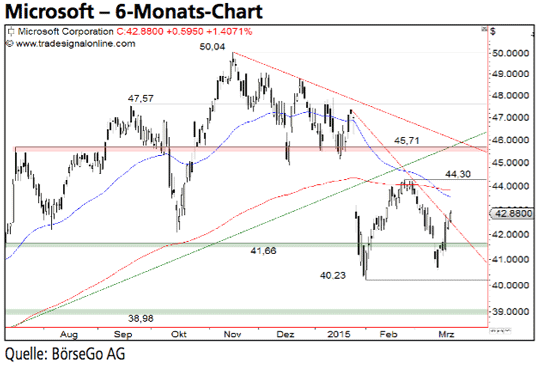 Ausblick: Die Bullen formieren sich aktuell bei den Aktien von Microsoft. Die Arbeit an einer nachhaltigen Bodenbildung hat nach unserer Auffassung begonnen. Die Long-Szenarien: Verbleiben die Aktien jetzt oberhalb der kurzfristigen Abwärtstrendlinie, dürfte sich der laufende Kaufimpuls bis an das Hoch von Ende Februar fortsetzen. An der 44,30 USD-Marke könnte es zu einer weiteren Korrektur kommen. Wird die Barriere dagegen überschritten, wäre die Bodenbildung erfolgreich abgeschlossen und ein Kaufsignal aktiv. In der Folge könnte sich der Anstieg bis 45,71 USD fortsetzen. Oberhalb dieser Marke würde bereits die übergeordnete Abwärtstrendlinie, die aktuell bei 47,00 USD verläuft, von den Käufern attackiert werden.