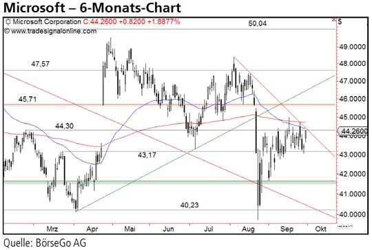 Ausblick: Die Aktien von Microsoft befinden sich nach dem steilen Anstieg seit Anfang September in einer schmalen Handelsspanne, innerhalb derer die Kaufwelle konsolidiert wird. Aus unserer Sicht dürfte sich dieser Seitwärtsbewegung eine weitere Kaufwelle anschliessen. Die Long-Szenarien: Verbleibt der Wert über der 43,17 USD-Marke, wäre ein Angriff auf den Widerstandsbereich von 44,30 bis 45,00 USD die Folge. Sollte es den Käufern gelingen, diese Zone zu überwinden, wäre ein Kaufsignal gebildet. Damit könnte der Wert zunächst bis 45,71 USD steigen. Oberhalb der Marke käme es zu einer Ausdehnung der Kaufwelle bis an die Hürde bei 47,57 USD. Wird dieser Widerstand gebrochen, könnte es mittelfristig sogar zu einem Angriff auf das Jahreshoch bei 50,04 USD kommen. Die Short- Szenarien: Wird die Unterstützung bei 43,17 USD dagegen nicht verteidigt, würde sich die Korrektur zunächst beschleunigen und die Aktien bis an die Haltemarke bei 41,66 USD drücken. An dieser Stelle könnte jedoch eine zweite Aufwärtsbewegung in Richtung 44,30 USD führen. Bei einem Bruch der Marke wäre jedoch ein Ausverkauf bis 40,23 USD die Folge.