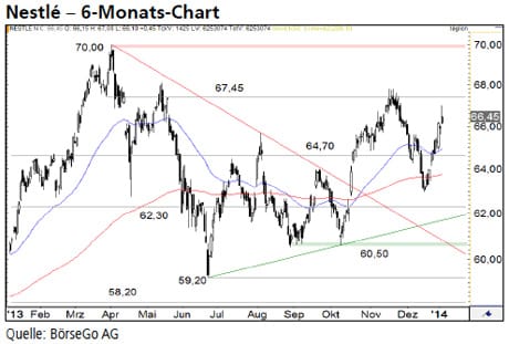 Rückblick: Nach ihrem vorläufigen Rallyhoch bei 70,00 CHF im März 2013 befanden sich die Aktien von Nestlé in einer Gegenbewegung, die einen Teil des übergeordneten Aufwärtstrends korrigierte.