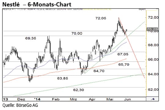Ausblick: Sowohl auf Wochen- als auch auf Tagesbasis zeigen sich bullishe Chartstrukturen. Das verlassene Dreieck eröffnet noch deutliches Aufwärtspotenzial für die Bullen. Die Konsolidierung der vergangenen zwei Wochen ändert daran nichts, ja ist vielmehr gesund, um Kräfte für den nächsten Aufwärtsimpuls sammeln zu können. Die Long-Szenarien: Nachdem das Hoch bei 70,00 CHF und auch die Horizontale bei 69,35 CHF erfolgreich als Unterstützung verteidigt und auch die Abwärtstrendlinie geknackt worden ist, sollten die Aktien zügig an das bisherige Allzeithoch bei 72,05 CHF ansteigen können. Aus dem Dreieck lässt sich mittelfristig ein Kursziel von 80,00 CHF ableiten, ein Etappenziel liegt bei 75,00 CHF. Die Short-Szenarien: Da bei 69,35 CHF auch der Aufwärtstrend seit März notiert, kann diese Marke als kurzfristige Schlüsselunterstützung genannt werden. Ein deutlicher Rückfall in das Dreieck wäre negativ zu werten und könnte Abgaben auf 67,05 CHF zur Folge haben. Solange die Marke von 63,85 CHF hält, dürften die Bären langfristig allenfalls temporär Chancen bekommen.