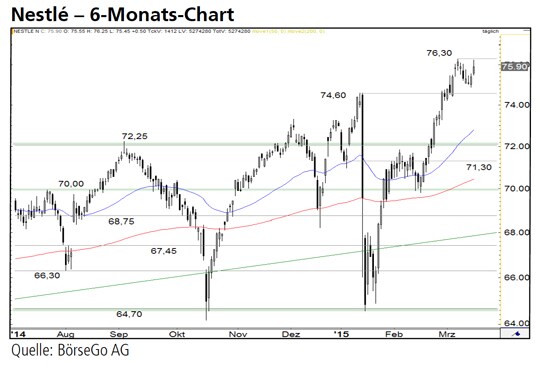 Rückblick: Die Aktien von Nestlé brachen im Januar über die Hürde bei 72,25 Franken und damit aus einem mehrmonatigen Seitwärtsmarkt aus.