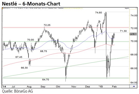 Ausblick: Aktuell nehmen die Bullen bei den Aktien von Nestlé bereits die 71,30 CHF-Marke in Angriff. Die gewaltige Erholung der letzten Tage könnte sich damit direkt fortsetzen. Die Long-Szenarien: Es würde einem massiven Befreiungsschlag gleichkommen, sollten die Käufer auch die Barriere bei 71,30 CHF überwinden können. In diesem Fall wären Zugewinne bis 72,25 CHF möglich. Wird auch diese Marke durchbrochen, wäre bereits der gesamte Ausverkauf von Mitte Januar neutralisiert und mit einem Angriff auf das aktuelle Allzeithoch bei 74,60 CHF zu rechnen. Die Short-Szenarien: Ebbt die Kaufwelle dagegen an der 71,30 CHF-Marke ab, käme es zunächst zu einer leichten Korrektur bis 70,00 CHF. Diese Unterstützung könnte jedoch zum Ausgangspunkt für einen neuen Anstieg werden. Sollte es dagegen zu einem Unterschreiten der Marke kommen, würde der Bereich um 68,75 CHF angesteuert. Auch an dieser Stelle hätten die Bullen nochmals die Gelegenheit, den steilen Kaufimpuls der letzten Tage fortzuführen. Darunter käme es hingegen zu einem Ausverkauf bis 66,30 CHF.