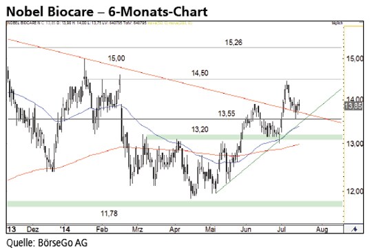 Ausblick: Aus dem Langfristchart lässt sich für die Aktie erheblicher Aufwärtsspielraum ableiten, sollten sich die positiven Tendenzen im Juli weiter fortsetzen. Die Korrektur als Reaktion auf die Aufwärtsbewegung aus dem Jahr 2013 scheint abgeschlossen. Die Long-Szenarien: Nach dem Rücklauf auf den bereits überwundenen Abwärtstrend stehen die Chancen für die Bullen gut, dass die Aktien ihre Aufwärtsbewegung fortsetzen können. Bei 14,50 CHF befindet sich ein kurzfristiger Widerstand. Wird er aus dem Markt genommen, könnte der auch im langfristigen Kontext richtungsweisende Widerstand bei 15,26 CHF angesteuert werden. Ein Ausbruch darüber wäre sehr positiv zu werten. Erst bei 20,00 CHF wäre in diesem Szenario wieder mit nennenswerter Gegenwehr der Bären zu rechnen. Die Short-Szenarien: Ein Rückfall in die Flaggenformation könnte dagegen die Bären auf den Plan rufen. Allerdings wären erst unterhalb von 13,00 CHF der kurzfristige Aufwärtstrend und eine wichtige Unterstützungszone aufgegeben. Das könnte erneut Abgaben bis zur massiven Unterstützung um 12,00 CHF bewirken, an der zumindest eine ausgeprägte technische Gegenbewegung zu erwarten wäre.