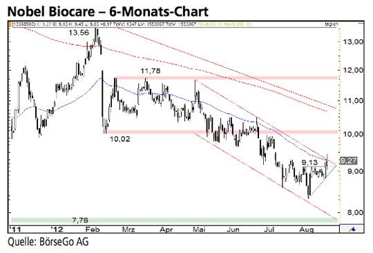 Ausblick: Die Aktien von Nobel Biocare befinden sich weiterhin in einem Abwärtstrend, dennoch ist der gestrige Anstieg aus unserer Sicht als erstes bullishes Achtungszeichen zu wer- ten. Die Long-Szenarien: Gelingt es der Käuferseite die Unterstützung bei 9,13 CHF zu verteidigen, könnte es zu einem nachhaltigen Ausbruch über die Abwärtstrendlinie kommen. In diesem Fall dürfte der Wert zunächst bis 9,70 CHF und darü- ber bis zum markanten Widerstand bei 10,02 CHF haussieren. Dort wäre mit einer kurzzeitgen Gegenbewegung zu rechnen. Kann im Anschluss auch die 10,02 CHF-Marke durchbrochen werden, wäre bereits ein mittelfristiges Kaufsignal aktiv. In dessen Folge könnte der Wert bis 11,00 CHF und auf mittle- re Sicht bereits bis 11,78 CHF ansteigen. Die Short-Szenarien: Fällt der Wert dagegen unter 9,13 CHF zurück, dürfte eine Korrektur bis 8,82 CHF einsetzen. Auf Höhe des Zwischentiefs vom vergangenen Freitag könnte sich eine Stabilisierung und ein weiterer Ausbruchsversuch über 9,50 CHF anschliessen. Sollten die Aktien dagegen unter diese Unterstützung zurück- setzen, wäre der Aufwärtsimpuls nach unserer Einschätzung vorerst beendet. In diesem Fall könnte eine Verkaufswelle bis 8,33 CHF einsetzen. Sollte auch diese Marke nicht verteidigt werden, droht ein mittelfristiger Ausverkauf auf 7,76 CHF.