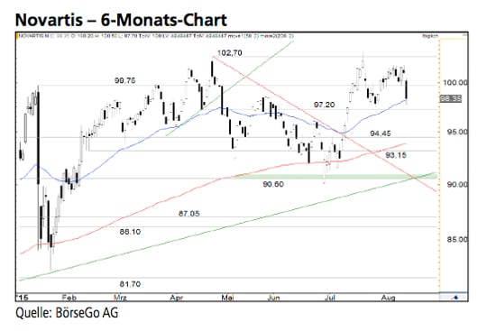 Dabei gelang es den Bullen das bis dahin gültige Allzeithoch zu überschreiten und die Rekordmarke Mitte April auf 102,70 CHF zu schrauben. Diesem Hoch schloss sich eine erneute steile Korrektur an, die Ende Juni mit einem bullishen Doppelboden bei 90,60 CHF abgeschlossen wurde. Seither dominiert wieder die Käuferseite, die die Aktien über den Kreuzwiderstand bei 94,45 CHF und die Barriere bei 97,20 CHF ausbrechen liess. Mitte Juli konnte das jüngste Allzeit hoch bereits kurz überschritten werden. Doch ausgehend von 103,20 CHF setzte in den letzten Tage eine Gegenbewegung ein, die die Aktien von Novartis in zwei Abwärtswellen aktuell wieder an den Bereich der soliden Unterstützung bei 97,20 CHF zurückführt. An dieser Marke wäre jedoch mit einer nachhaltigen Bodenbildung und einer anschliessenden neuerlichen Aufwärtsbewegung zu rechnen.