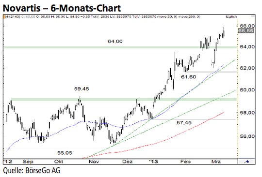 Rückblick: Im Juli 2012 beendeten die Aktien von Novartis mit dem Ausbruch über eine mittelfristige Abwärtstrendlinie einen mehrwöchigen Seitwärtsmarkt. In der...