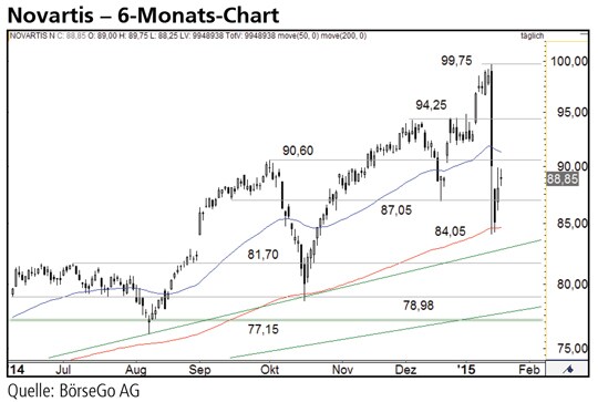 Ausblick: Bislang handelt es sich bei den Aufschlägen der vergangenen Tage aber nur um eine technische Gegenreaktion. Für eine direkte Fortsetzung der langfristigen Aufwärtsbewegung muss der Wert noch einige Widerstände aus dem Weg räumen. Die Long-Szenarien: Bereits bei 90,60 CHF könnte die Erholung ins Stocken geraten und der Wert wieder nach unten abdrehen. Bleiben die Bullen aber am Ball, wäre oberhalb von 90,60 CHF eine weitere Erholungswelle bis zur Horizontalen bei 94,25 CHF denkbar. Dort hätten die Bären voraussichtlich die letzte Möglichkeit, zurückzuschlagen. Geht es dagegen auch über den Widerstand bei 94,25 CHF, wäre wohl technisch gesehen das Schlimmste überstanden. Das bisherige Allzeithoch bei 99,75 CHF käme in diesem Fall wieder ins Spiel. Die Short-Szenarien: Solange der Aufwärtstrend und das letzte Tief um 84,00 CHF verteidigt werden, besteht Hoffnung für die Bullen. Im Falle eines weiteren Kursrutsches auf neue Verlaufstiefs sollten sich die Aktionäre aber auf Abgaben bis zu einer zweiten langfristigen Aufwärtstrendvariante bei rund 78,00 CHF einstellen. Etwas darunter befindet sich bei 77,15 CHF eine weitere solide Unterstützung im Chart.
