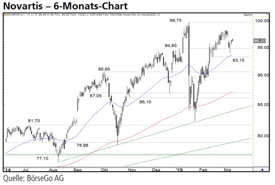 Rückblick: Nach dem erfolgreichen Ausbruch über das damalige Allzeithoch bei 77,15 CHF im Mai 2014 setzten die Aktien von Novartis ihren langfristigen Aufwärtstrend in einer volatilen Kaufwelle fort und markierten mit 99,75 CHF Mitte Januar 2015 einen neuen Rekordwert.