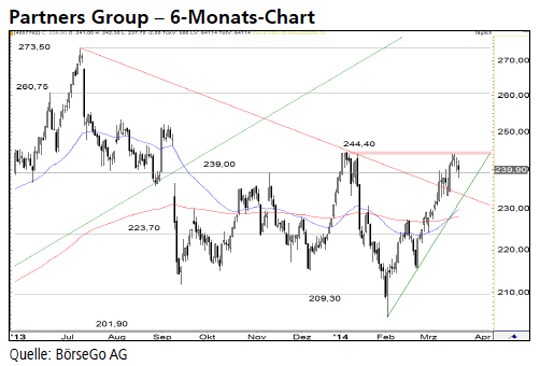 Rückblick: Die Aktien von Partners Group beendeten einen mehrmonatigen steilen Anstieg mit einem Hoch bei 273,50 CHF im Juli des letzten Jahres und setzten anschliessend an die Unterstützung bei 239,00 CHF zurück.