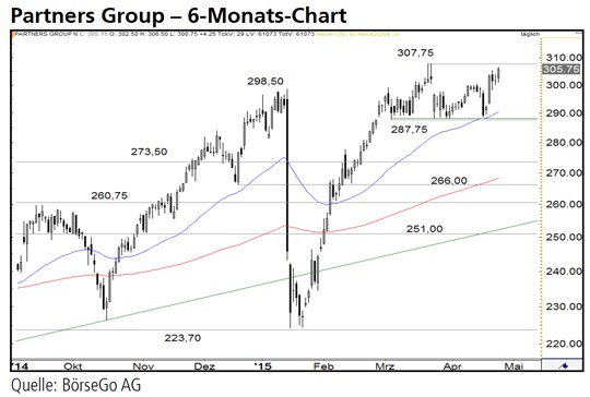Ausblick: Knapp unterhalb ihres neuen Allzeithochs liegen die Bullen bei den Aktien von Partners Group auf der Lauer und bereiten einen Ausbruch vor. Damit könnten sie den exorbitanten Aufwärtsimpuls seit dem Einbruch im Januar nahtlos fortsetzen. Die Long-Szenarien: Bei einem Anstieg über die neue Rekordmarke von 307,75 CHF wäre ein kurzfristiger, bullisher Doppelboden bei 287,75 CHF erfolgreich abgeschlossen worden und aufgrund dieses Kaufsignals mit einer weiteren Aufwärtsbewegung bis 320,00 CHF zu rechnen. An dieser Stelle könnte es zu einem Rücklauf an die aktuelle Rekordmarke kommen, ehe sich die Rally auf mittlere Sicht bis in den Bereich um 340,00 CHF ausdehnen könnte. Langfristig wären bei einem Ausbruch über 307,75 CHF sogar Kurse um 360,00 CHF erreichbar. Die Short-Szenarien: Scheitert der laufende Ausbruchsversuch über das neue Allzeithoch dagegen in der kommenden Woche, müsste man sich auf eine leichte Korrektur bis an die Unterstützung bei 287,75 CHF einstellen. Diese solide Haltemarke sollte allerdings von der Käuferseite zur Fortsetzung des Aufwärtstrends genutzt werden. Zu einer mehrtägigen Ausdehnung der Korrektur bis an die 273,50 CHFMarke käme es dagegen bei einem Bruch der Unterstützung.