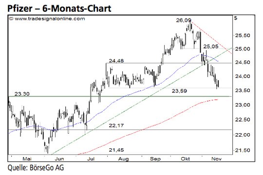 Die Korrektur der Aktien von Pfizer ist nach unserer Auffassung noch nicht abgeschlossen, dennoch ist davon aus- zugehen, dass die Unterstützung bei 23,30 USD dem Ansturm der Bären Stand halten sollte. Die Long-Szenarien: Zunächst dürfte der Wert bis 23,30 USD zurücksetzen. Hier könnte es jedoch bereits zu einer Bodenbildung kommen und die Aktien bis 24,48 USD ansteigen. Oberhalb dieses Widerstands könnte eine deutliche Erholung bereits bis 25,05 USD führen. Allerdings müsste auf diesem Niveau mit einer weiteren mehrtä- gigen Abwärtsbewegung gerechnet werden, die durchaus bis 23,30 USD zurückführen könnte. Gelänge auf diesem Niveau ein Doppelboden, könnte sich der Aufwärtstrend des Wertes bis 26,09 USD und darüber bis auf 27,73 USD fortsetzen. Die Short-Szenarien: Kann die Unterstützung bei 23,30 USD hingegen nicht verteidigt werden, dürfte ein Ausverkauf bis 22,70 USD und darunter bis auf 22,17 USD belasten. Würde dort eine Stabilisierung ausbleiben, wäre eine mittelfristige Verkaufswelle bis 21,45 USD denkbar. Erst auf diesem Niveau könnte es anschliessend zu einer Bodenbildung kommen.