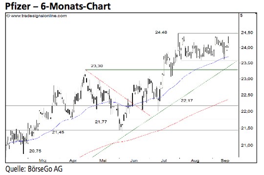 Oberhalb von 23,30 USD haben die Bullen den Wert weiter in ihrer Hand. Ein Ende der Seitwärtsbewegung könnte entsprechend durch einen Ausbruch über das Verlaufshoch ausgelöst werden. Die Long-Szenarien: Sollte den Bullen jetzt der nachhaltige Ausbruch über den Widerstand bei 24,48 USD gelingen, wäre eine Kaufwelle bis 25,85 und 26,00 USD zu erwarten. An dieser Stelle dürfte eine kurzfristige Gegenbewegung einsetzen. Sollte auch diese Kursbarriere überwunden werden, könnte sich der übergeordnete Aufwärtstrend mittelfristig bis 27,73 USD fortsetzen. Die Short-Szenarien: Derzeit ist der Wert oberhalb des früheren Verlaufshochs bei 23,30 USD bullish zu werten. Erst ein nachhaltiger Bruch dieser Unterstützung würde das charttechnische Bild eintrüben. Abgaben bis 22,45 USD und darunter auf 22,17 USD dürften einem Rückfall unter diese Marke folgen. Kann dieser Preisbereich nicht zu einem weiteren Anstieg genutzt werden, könnten die Aktien von Pfizer jedoch auf mittlere Sicht bereits bis 21,45 USD ausverkauft werden.