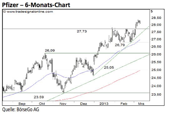Rückblick: Zu Beginn des Jahres 2011 durchbrachen die Aktien von Pfizer eine langfristige Abwärtstrendlinie und setzten seither den Mitte 2009...