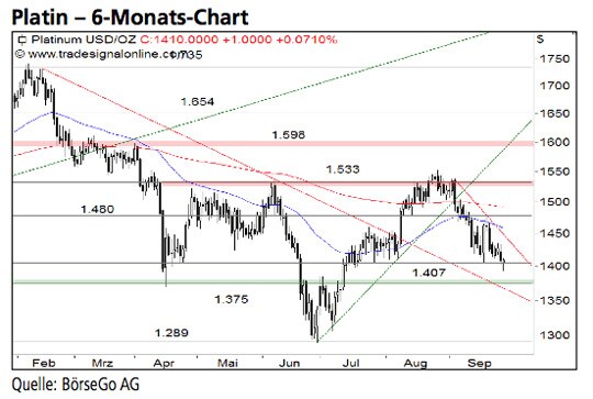 Aufgrund der jüngsten Schwäche und insbesondere des Ausverkaufs Ende der vergangenen Woche sollte sich der Abwärtstrend aus unserer Sicht fortsetzen. Die Short-Szenarien: Gelingt es der Käuferseite jetzt nicht, die wichtige Unterstützung bei 1.407,00 USD zu verteidigen und für einen neuerlichen Anstieg zu nutzen, wäre ein Verkaufssignal aktiv. Zugleich wäre damit der Aufwärtstrend seit Ende Juni beendet. Zunächst dürfte der Wert bis 1.375,00 USD einbrechen, schliesslich jedoch auch diese Unterstützung unterschreiten. In der Folge wäre mit einem Verkaufsimpuls bis 1.289,00 USD zu rechnen, ehe sich Platin auf diesem Niveau stabilisieren sollte. Die Long-Szenarien: Wird die 1.407,00 USD-Marke dagegen verteidigt, könnte eine Erholung bis an die Barriere bei 1.480,00 USD führen. Allerdings wäre erst ein nachhaltiger Anstieg über diese Hürde ein bullishes Zeichen. Anschliessend könnte eine Kaufwelle bis 1.533,00 USD einsetzen. Es ist allerdings derzeit zu bezweifeln, ob dieser starke Widerstand im zweiten Anlauf durchbrochen werden kann.