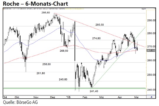 Ausblick: Die Aktien von Roche hätten sich nach unserer Auffassung nach dem starken Anstieg der letzten Monate eine korrektive Auszeit verdient. Diese könnte jedoch in Kürze enden. Die Long-Szenarien: Ausgehend von der Unterstützung bei 268,50 CHF dürfte der Wert jetzt wieder an die 274,80 CHF-Marke steigen. Wird der kleine Widerstand überschritten, käme es oberhalb von 280,00 CHF zu einem Angriff auf die markante Barriere bei 285,50 CHF. Sollte es den Bullen bereits gelingen, auch diesen Preisbereich zu überwinden, wäre ein erneutes Kaufsignal aktiviert und mit einer Kaufwelle bis an das Rekordhoch bei 295,80 CHF zu rechnen. Darüber stünde der Weg bis 305,00 CHF frei. Die Short-Szenarien: Setzen die Aktien dagegen unter die Haltemarke bei 268,50 CHF zurück und brechen in der Folge auch unter das Korrekturtief bei 264,70 CHF ein, dürfte sich die Korrektur zunächst bis 258,60 CHF ausdehnen. Dort würde sich der weitere Verlauf entscheiden: Wird die Marke verteidigt, käme es zu einem Anstieg in Richtung von 280,00 CHF. Sollte sie dagegen gebrochen werden, dürften Verluste bis 251,80 und 241,40 CHF belasten.