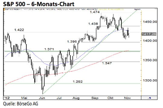 Korrekturphase bereits an dieser Stelle enden und der S&P 500 wieder in Richtung des Rallyhochs ansteigen. Setzt der Wert dagegen nachhaltig unter 1.395 Punkte zurück, dürfte eine weitere Verkaufswelle bis 1.385 Punkte und darunter bis 1.371 Punkte einsetzen. Die Long-Szenarien: Steigt der Index dagegen ein weiteres Mal über den Widerstand bei 1.422 Punkten, könnte die 1.438 Punkte-Marke erneut angesteuert werden. An dieser Stelle ist aus unserer Sicht jedoch mit einem weiteren Ausverkauf zu rechnen. Erst wenn es den Bullen gelingt, diese Hürde auf Tagesschlusskursbasis zu überschreiten, wäre eine deutliche Aufwärtsbewegung möglich, die oberhalb von 1.456 Punkten bis 1.474 Punkte führen könnte.