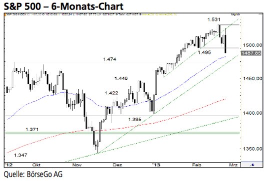 Der gestrige Ausverkauf hat Spuren hinterlassen und deutet eine vorübergehende Korrekturphase an. Die Short-Szenarien: Unterhalb von 1.495 Punkten ist der Index derzeit angeschlagen und dürfte bis zur Unterstützung bei 1.474 Punkten zurückfallen. Dort könnte ein weiterer, mehrtägiger Aufwärtsimpuls einsetzen. Sollte es an dieser Haltemarke jedoch nicht zu einer Erholung kommen, könnten bereits Abgaben bis 1.448 Punkte belasten. Spätestens dort dürften die Käufer wieder in das Geschehen eingreifen und eine Erholung auslösen. Andernfalls droht ein Ausverkauf bis 1.422 Punkte. Die Long-Szenarien: Kann der S&P 500 Index dagegen die 1.495 Punkte-Marke direkt zurückerobern, könnte ober- halb von 1.500 Punkten eine kurzfristige Aufwärtsbewegung bis 1.515 Punkte einsetzen. An dieser Stelle wäre wiederum mit aufkommendem Abgabedruck zu rechnen. Sollte der Wi- derstand dagegen durchbrochen werden, wäre dies ein klares Zeichen für die Wiederaufnahme des Aufwärtstrends.