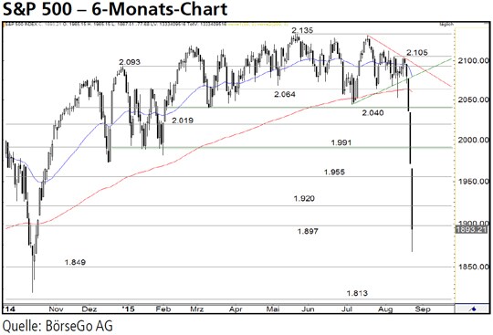 Ausblick: Die Bären haben mit aller Gewalt zugeschlagen und fast die komplette Aufwärtsbewegung seit Oktober 2014 in nur zwei Handelstagen zunichte gemacht. Damit ist auch im mittelfristigen Bild ein Trendwechsel zu Gunsten der Verkäufer vollzogen worden. Die Short-Szenarien: Kann sich der Index jetzt über 1.897 Punkte zurückarbeiten, könnte eine leichte Erholung bis 1.920 Punkte führen. Dort sollte sich der Einbruch allerdings weiter fortsetzen. Setzt der S&P 500 anschliessend weiter unter 1.849 Punkte zurück, würde dies zu einem Ausverkauf bis 1.813 Punkte führen. Darunter würde die mittelfristige Unterstützung bei 1.775 Punkten angesteuert. Auf Grund der gewaltigen Dynamik des Ausverkaufs könnte es sogar zu einem Verkaufsimpuls bis 1.750 Punkte kommen. Die Long-Szenarien: Bei einem Wiederanstieg über 1.920 Punkte dürfte der Index dagegen kurzzeitig bis 1.955 Punkte steigen. Hier wäre wiederum mit einer weiteren Verkaufswelle und Abgaben in Richtung der 1.920 Punkte-Marke zu rechnen. Oberhalb von 1.955 Punkten könnte eine Erholung dagegen bis 1.991 Punkte führen.