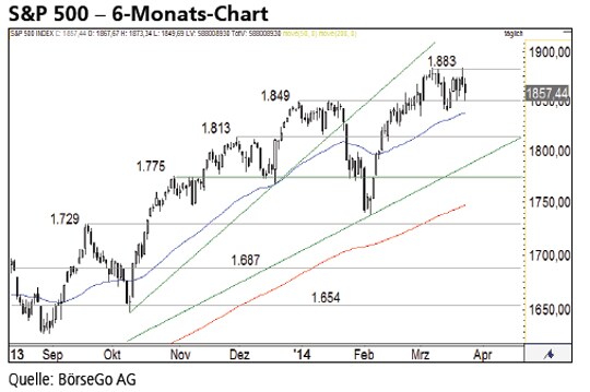 Ausblick: Der Index ist kurzfristig neutral zu werten. Da der Trend mittel- und auch langfristig weiter nach oben zeigt, haben die Bullen aktuell leicht die Nase vorne. Neue prozyklische Handelssignale dürften in Kürze entstehen. Die Long-Szenarien: Um sich neues Aufwärtspotenzial zu verschaffen, benötigt der S&P 500 in Kürze einen Tagesschlusskurs oberhalb von 1.883 Punkten. Je früher dieses Signal generiert wird, desto besser. Denn eine mögliche bearishe Umkehr im Chart wäre damit abgewendet, der übergeordnete Aufwärtstrend bestätigt. Über 1.883 Punkten dürften die Bullen in einem ersten Schritt die runde Marke bei 1.900 Punkten als Ziel anpeilen. Im weiteren Verlauf wären auch Kurse um 1.925 Punkte vorstellbar. Die Short-Szenarien: Als massive Unterstützung hat sich in den vergangenen Tagen die Marke von 1.849 Punkten erwiesen. Sollten die Bären jedoch nicht nachlassen und den Index im weiteren Wochenverlauf unter diese Marke drücken, würde das Verlaufstief bei 1.839 Punkten Unterstützung bieten. Kurse unter diesem lokalen Tief wären jedoch kurzfristig fatal. Der Index hätte dann ein Doppelhoch ausgebildet und könnte in Richtung 1.813 Punkte ausverkauft werden.