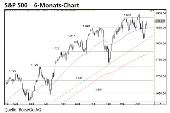 Rückblick: Seit dem Erreichen eines neuen Allzeithochs bei 1.897 Punkten Anfang April, setzte der S&P 500 Index in einer zweigeteilten Abwärtsbewegung bis zur Unterstützung bei 1.813 Punkten zurück.
