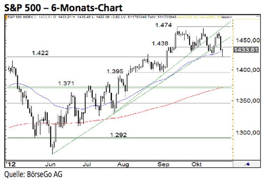 Die tendenziell bearishen Vorzeichen des drohenden Doppelhochs wurden durch den Ausverkauf am Freitag bestätigt. Gestern wurde bereits die Unterstützung bei 1.422 Punkten attackiert. Die Long-Szenarien: Sollte der Index unterhalb von 1.445 Punkten verbleiben, dürfte es zunächst zu einem weiteren Test der 1.422 Punkte-Marke kommen. Diese müsste nach unserer Auffassung von den Bullen verteidigt werden, um eine kurzfristige Topbildung zu verhindern. Kann der Index oberhalb dieser Unterstützung verbleiben und anschliessend über 1.445 Punkte ansteigen, dürfte eine Erholung bis 1.456 und 1.465 Punkte einsetzen. Selbst ein Anstieg an das Ral- lyhoch wäre in diesem Fall denkbar. Die Short-Szenarien: Ein nachhaltiger Bruch der Unterstützung bei 1.422 Punkten würde dagegen einen kurzfristigen Ausverkauf bis 1.410 Punkte und darunter auf 1.395 Punkte auslösen. An dieser Stelle wäre jedoch mit einer Bodenbildung und einem mittelfristigen Wiederanstieg zu rechnen. Dagegen würde ein Kursrutsch unter 1.395 Punkte ein stärkeres Verkaufssignal auslösen. In der Folge dürfte der Wert bis 1.371 Punkte fallen.