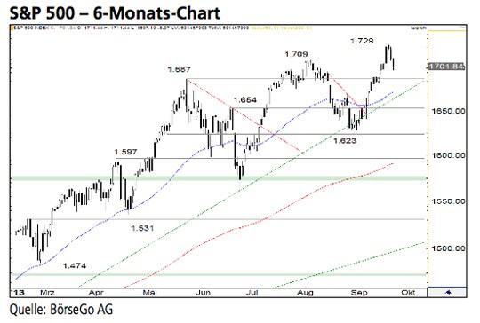 Rückblick: Nachdem die Bullen Ende August die mittelfristige Aufwärtstrendlinie beim S&P 500 Index auf Höhe von 1.623 Punkten verteidigt hatten, folgte...