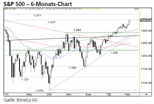 Ausblick: Mit dem Erreichen der 1.347 Punkte-Marke steht der S&P 500 Index kurz vor einer weiteren kurzfristigen Weichenstellung. Sollte dieser Bereich überwunden werden, kann eine weitere Aufwärtsbewegung bis an das Hoch aus 2011 führen. Die Long-Szenarien: Gelingt es den Käufern den Index über 1.347 und 1.355 Punkte zu treiben, ist mit einer weiteren Kaufwelle bis 1.371 Punkte zu rechnen. Wird auch das Hoch des letzten Jahres durchbrochen, sind bereits Zugewinne bis 1.415 und 1.425 Punkte möglich. Entsprechend könnte man einen Anstieg über 1.355 Punkte „long“ handeln und bei 1.415 Punkten Gewinnmitnahmen ins Auge fassen. Die Short-Szenarien: Leichte Korrekturbewegungen bis 1.300 und gegebenenfalls 1.292 Punkte wären erst bei einem nachhaltigen Rückfall unter 1.317 Punkte zu erwarten. Unterhalb von 1.292 Punkten wäre der seit Ende Dezember gültige Aufwärtstrend jedoch vorerst unterbrochen. In diesem Fall wäre eine deutlichere Abwärtsbewegung bis 1.270 und darunter auf 1.255 Punkte aus unserer Sicht die Folge. Dort könnten sich die Käufer jedoch wieder zurückmelden und einen weiteren mittelfristigen Anstieg an die bisherigen Hochpunkte einleiten.