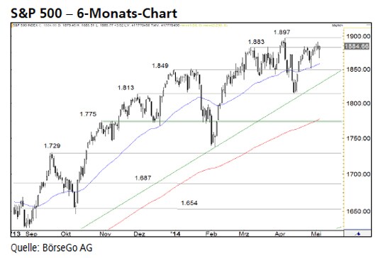 Rückblick: Nach der Verteidigung der Unterstützung bei 1.813 Punkten stieg der S&P 500 Index ab Mitte April wieder über die zuvor unterschrittene Unterstützung bei 1.849 Punkten an...
