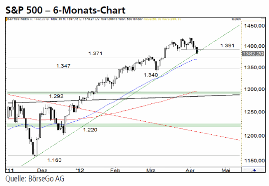 Ausblick: Der Index erscheint, trotz möglichen Trendlinienbruchs, nach unten gut abgesichert. Unserer Einschätzung nach könnte daher die laufende Abwärtsbewegung bald enden und zugleich ideale Einstiegschancen bieten. Die Long- Szenarien: Aufgrund der gestrigen Unterschreitung der Unterstützung von 1.391 Punkten sind kurzfristig betrachtet zwar weitere Rücksetzer bis 1.371 Punkte nicht auszuschliessen, doch spätestens dort sehen wir die Möglichkeit zur Wiederaufnahme der Aufwärtsbewegung seit Oktober 2011 gegeben, welche man „long“ handeln könnte. In der Folge wären Indexgewinne bis zur runden Marke von 1.400 Punkten denkbar, bevor darüber der noch ausstehende Zielbereich von 1.425 bis 1.430 Punkte erreichbar sein sollte. Die Short- Szenarien: Ein Test der Unterstützung bei 1.371 Punkten ist aktuell durchaus möglich. Ein Bruch dieses Niveaus auf Tagesschlussstandbasis könnte allerdings die nächste Verlaufswelle einleiten und dabei zu weiter fallenden Indexnotierungen bis mindestens 1.340 Punkten führen.