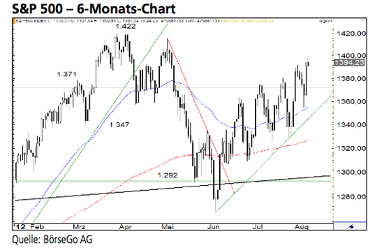 Rückblick: Nach wochenlangem Ringen gelang den Bullen beim S&P 500 Index Ende Juli der Ausbruch über die Wider- stände bei 1.371 und 1.380 Punkten...