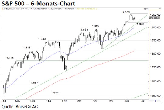 Ausblick: Der laufenden Gegenbewegung fehlt die nötige Durchschlagskraft, um den massiven Aufwärtstrend zu gefährden. Aus unserer Sicht dürften die Bullen die Hausse in Kürze wieder aufnehmen. Die Long-Szenarien: Kurzfristig könnte der S&P 500 an die Unterstützung bei 1.920 Punkten zurückfallen, dürfte auf diesem Niveau jedoch wieder auf Käufer treffen und den Aufwärtstrend fortsetzen. Dabei wäre ein Anstieg über den kleineren Widerstand bei 1.944 Punkten bereits wieder bullish zu werten und könnte einen Angriff auf die 1.955 Punkte-Marke auslösen. Sollte das Rekordhoch in der Folge durchbrochen werden, dürfte der Index auf 1.970 Punkte und darüber bereits bis an die runde 2.000 Punkte-Marke haussieren. Die Short-Szenarien: Erst ein nachhaltiger Bruch der 1.920 Punkte-Marke würde für eine Fortsetzung der Korrekturbewegung sprechen. Damit wäre zugleich auch die steile kurzfristige Aufwärtstrendlinie unterschritten und entsprechend ein kleines Verkaufssignal generiert. Auf Sicht der kommenden Tage würde der Index in diesem Fall bis 1.897 Punkte zurücksetzen. Sollten die Käufer dort nicht stabilisierend eingreifen können, käme es zu weiteren Abgaben bis 1.883 Punkte.