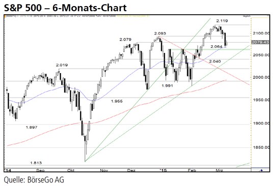 Rückblick: Ende Februar erreichte der S&P 500 Index im Rahmen seines steilen Aufwärtstrends ein neues Allzeithoch bei 2.119 Punkten, das zugleich den bisherigen Höhepunkt der übergeordneten Rally darstellt.