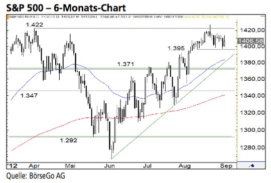 Ausblick: Unterhalb von 1.415 Punkten befindet sich der Index in einer intakten Korrekturbewegung, die bei einem Rück- setzer unter 1.395 Punkte bis zur mittelfristigen Aufwärtstrendlinie zurückführen dürfte. Die Long-Szenarien: Sollte der S&P 500 Index unter 1.395 Punkte fallen, könnte eine weitere Kaufwelle nach einer Korrektur auf 1.387 Punkte folgen. Eine erfolgreiche Verteidigung der Aufwärtstrendlinie, die aktuell auf diesem Niveau verläuft, könnte einen Anstieg über den Widerstand bei 1.415 Punkten auslösen. In der Folge dürfte der Wert bis 1.427 Punkte haussieren. Wird auch diese Mar- ke durchbrochen, wäre bereits mit einem Aufwärtsimpuls bis 1.440 und 1.460 Punkte zu rechnen. Die Short-Szenarien: Ein Rückfall unter 1.387 Punkte hätte dagegen eine Korrekturaus- weitung bis 1.371 Punkte zur Folge. Doch selbst ausgehend von diesem Niveau könnte das Jahreshoch erneut attackiert werden. Erst ein nachhaltiger Ausverkauf unter 1.371 Punkte würde für ein Ende der Hausse und weitere Verluste bis zur Unterstützung bei 1.347 Punkten sprechen.
