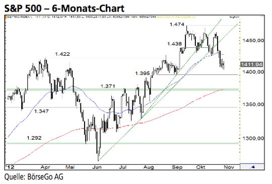 Mit dem Rückfall unter das frühere Jahreshoch haben die Bären aus unserer Sicht eine mittelfristige Korrekturphase eingeleitet. Deren erstes Ziel ist bereits in Reichweite. Die Short-Szenarien: Unterhalb von 1.422 Punkten ist davon auszugehen, dass der Index bis zur Unterstützung bei 1.395 Punkten zurückfällt, ehe es zu einer Erholung kommen dürfte. Diese könnte den Wert bis 1.422 Punkten und darüber bereits bis 1.438 Punkte führen, ohne die mittelfristige Korrektur zu unterbrechen. Spätestens bei 1.438 Punkten wäre mit einer zweiten Abwärtsbewegung auf 1.395 Punkte zu rechnen. Würde auch diese Marke unterschritten, sind weitere Abgaben bis 1.385 und 1.371 Punkte zu erwarten. Die Long-Szenarien: Erst ein nachhaltiger Anstieg über 1.438 Punkte würde derzeit für ein Ende der Abwärtstendenz sprechen. In diesem Fall könnte der S&P 500 Index bis 1.464 Punkte und darüber bis zum Verlaufshoch bei 1.474 Punkten ansteigen. Ob es den Käufern direkt gelingt die Marke zu durchbrechen und den Index bis 1.490 Punkte anzutreiben, ist derzeit fraglich.
