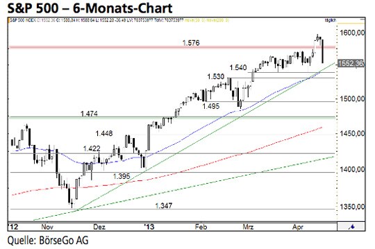 Der langerwartete charttechnische Befreiungsschlag im S&P 500 Index ist damit zunächst vertagt. Für die Bullen gilt es jetzt, den Index im Bereich der Unterstützungszone von 1.530 bis 1.540 Punkten zu stabilisieren, um weitere Verluste zu vermeiden. Die Long-Szenarien: Noch ist das übergeordnete Kaufsignal intakt. Hierzu muss jedoch zwingend der Bereich um 1.540 Punkte verteidigt werden. Gelingt dies und kann der Index in der Folge über 1.576 Punkte zurückfinden, wäre mit einem Aufwärtsimpuls bis 1.597 Punkte zu rechnen. An dieser Stelle ist mit einer harten Auseinandersetzung der Marktteilnehmer zu rechnen. Darüber könnte der Wert bis 1.615 Punk- te und auf mittlere Sicht bereits bis 1.680 Punkte ansteigen. Die Short-Szenarien: Ein Rückfall unter 1.540 Punkte würde allerdings die Bären wieder auf den Plan rufen. Das Überschreiten des neuen Allzeithochs hätte sich damit als Fehlsignal entpuppt, welches durchaus weitere Abgaben bis zunächst 1.530 Punkte zur Folge haben könnte. Unterhalb von 1.530 Punkten würde bereits ein Ausverkauf bis 1.495 Punkte und damit auch eine mittelfristige Trendwende drohen.
