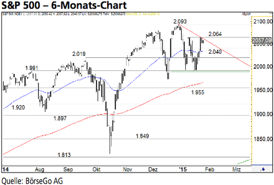 Ausblick: Der S&P 500 Index orientierte sich folglich perfekt an den herausgearbeiteten Chartmarken. Diese können für die kommenden Handelstage sowohl auf Seiten der Käufer als auch auf der Bullenseite als bestätigt angesehen werden. Eine neue Trendbewegung liegt förmlich in der Luft. Die Long-Szenarien: Der Schlüsselwiderstand im Chart befindet sich weiter - hin in Form des Kreuzwiderstands bei 2.064 Punkten. Solange der Index sich darunter befindet, hat die Konsolidierung Bestand. Ein Anstieg über 2.064 Punkte hingegen würde einem technischen Befreiungsschlag gleichkommen und den Weg in Richtung des Hochs bei 2.093 Punkten frei machen. Über 2.093 Punkte könnten die Bullen sogar die Marke von 2.170 Punkten als Ziel anpeilen. Die Short-Szenarien: Die mit dem gestrigen Tief untermauerte Chartunterstützung bei 2.040 Punkten muss aus Käufersicht halten. Andernfalls dürfte der Index auf 2.019 Punkte korrigieren. Kommt in der Folge weiterer Verkaufsdruck auf, müsste man sogar mit Abgaben bis auf 1.991 Punkte rechnen. Dort ist der S&P 500 Index allerdings sehr gut abgesichert und könnte erneut eine Richtungsänderung nach oben vollziehen.