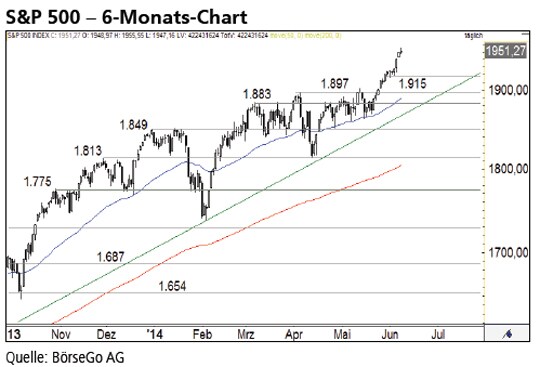 Ausblick: Der S&P 500 Index will weiter nach oben. Es ist wahrscheinlich, dass die Bullen, zwischenzeitliche Konsolidierungen vorausgesetzt, in den kommenden Tagen auch noch die magische Marke von 2.000 Punkten anpeilen werden. Die Long-Szenarien: Klassische Widerstände existieren aufgrund der nahezu täglichen neuen Allzeithochs keine mehr. Konsolidierungen dürften zunächst auf hohem Niveau verlaufen. Ein Schlusskurs über 1.955 Punkte würde Anschlusspotenzial auf 1.970 Punkte und anschliessend auf 2.000 Punkte freisetzen. Konsolidierungen, die oberhalb der Marke von 1.915 Punkten verlaufen, würden das bullishe Chartbild nicht gefährden. Die Short-Szenarien: Scheitert der Index dagegen deutlich an der Marke von 1.955 Punkten und gibt im Wochenverlauf auch die Unterstützung bei 1.915 Punkten auf, wäre dies ein Hinweis für eine ausgedehntere Konsolidierung. Diese könnte den S&P 500 Index noch einmal auf die Unterstützungen bei 1.897 und 1.883 Punkten zurückführen. Spätestens dort dürften die Bullen die Notierung aber wieder schnell auffangen.