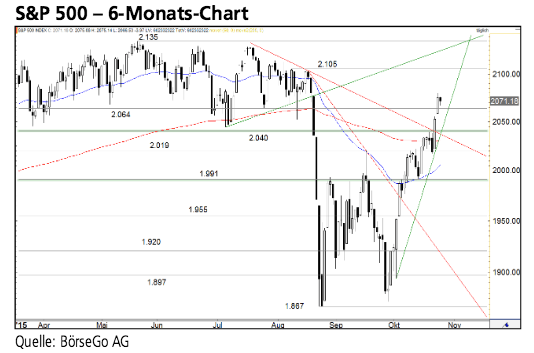 Der bullishe Doppelboden im Bereich von 1.867 Punkten entfaltete seit Anfang Oktober beim S&P 500 Index seine Wirkung und sorgte für einen massiven Aufwärtsimpuls, der in der vergangenen Woche sogar zum Ausbruch über den Widerstand bei 2.040 Punkten führte.