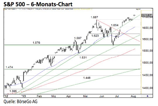 Mit dem Kaufimpuls der vergangenen Tage haben die Käufer den Aufwärtstrend des S&P 500 beeindruckend fortgesetzt. Allerdings stellt sich ihnen jetzt ein Widerstand in den Weg. Die Long-Szenarien: Sollte es den Bullen auch gelingen, das rechnerische Kursziel bei 1.710 Punkten zu über- winden, dürfte sich die Rally des Index kurzfristig bis 1.717 Punkte ausdehnen. An dieser Stelle könnte es zu einer leichten Gegenbewegung kommen. Durchbrechen die Käufer im An-schluss auch die 1.717 Punkte-Marke, dürfte der Wert weiter bis 1.733 Punkte und darüber bereits bis 1.750 Punkte ansteigen. Die Short-Szenarien: Kurzfristig wäre eine Korrektur bis 1.697 Punkte und darunter gegebenenfalls bis 1.687 Punkte nach dem dynamischen Anstieg der letzten Tage nicht ungewöhnlich. Spätestens auf dem Niveau des früheren Allzeithochs sollten die Bullen allerdings wieder aktiv werden und einen weiteren Anstieg auslösen. Setzt der Index dagegen wieder unter 1.687 Punkte zurück, dürfte sich diese Gegenbewegung bis 1.654 Punkte ausweiten. An dieser Stelle hätten die Bullen ein weiteres Mal die Chance, die Hausse fortzusetzen. Ein Bruch der Marke würde dagegen ein Verkaufssignal auslösen.
