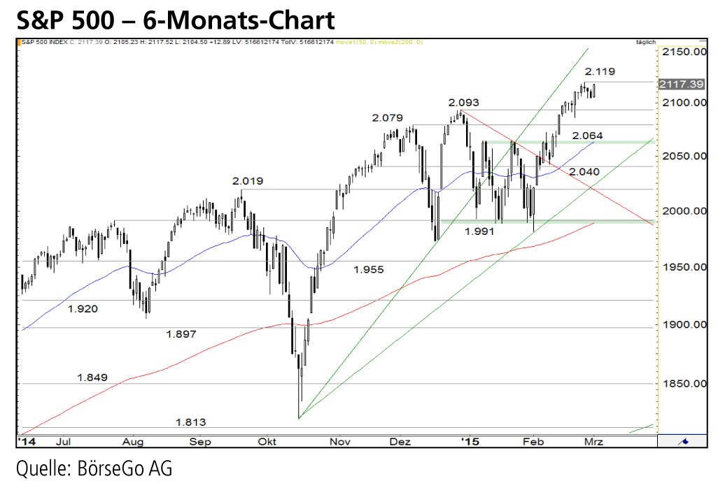 Rückblick: Nach dem Ausbruch über den Widerstand bei 2.064 Punkten setzte sich der Aufwärtsimpuls des S&P 500 Index auch im Februar fort und sorgte für einen Anstieg über das Allzeithoch von Ende Dezember 2014 bei 2.093 Punkten.