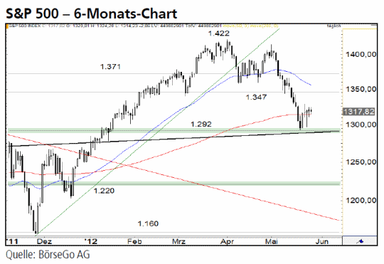 Rückblick: Der S&P 500 Index fiel nach dem kurzfristigen Verkaufssignal, das durch den Bruch der 1.347 Punkte-Marke Mitte Mai ausgelöst wurde, bis zur wichtigen Unterstützung bei 1.292 Punkten.