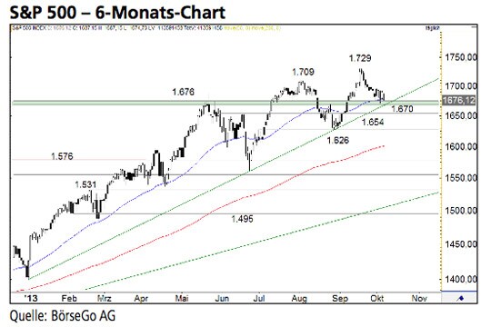Durch das Seitwärtsgeschiebe hat sich an den Aussagen der Vorgängeranalyse nichts verändert. Das Unterstützungsbollwerk um 1.670 Punkte bestehend aus der mittelfristigen Aufwärtstrendlinie, einer horizontalen Haltemarke wie auch dem EMA50 könnte die Käufer im S&P 500 Index wieder auf den Plan rufen. Viel Zeit bleibt ihnen aber nicht mehr. Die Long-Szenarien: Im Laufe der Woche besitzt der Index ausgehend von der Unterstützungszone um 1.670 Punkte sehr gute Erholungschancen. Dabei könnte der Wert erneut das Augusthoch bei 1.709 Punkten als Ziel ansteuern. Ein Ausbruch über diese Marke wäre sehr positiv zu werten und würde den Weg in Richtung des bisherigen Allzeithochs bei 1.729 Punkten wieder frei machen. Die Short-Szenarien: Ein signifikantes Unterschreiten der Marke von 1.670 Punkten würde hingegen den mittelfristigen Aufwärtstrend beenden. Bei 1.654 Punkten hätten die Bullen dann die letzte Chance, den S&P 500 Index aufzufangen. Andernfalls dürfte er bis zum Zwischentief bei 1.626 Punkten ausverkauft werden.