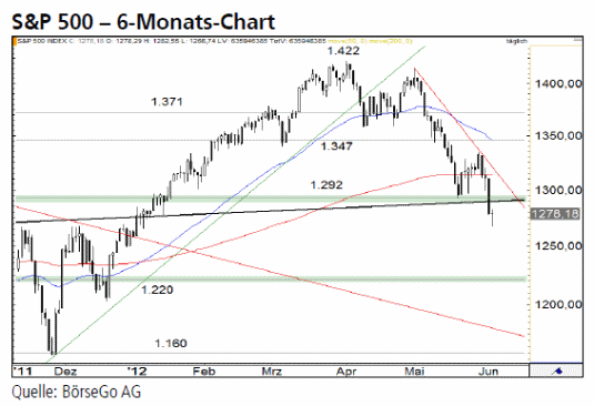 Ausblick: Mit dem Bruch der 1.292 Punkte-Marke haben die Bullen die Chance auf eine kurzzeitige Erholung vergeben. Eine übergeordnete Fortsetzung der Abwärtsbewegung ist daher aus unserer Sicht zu präferieren. Die Short-Szenarien: Unterhalb von 1.292 Punkten dürfte der S&P 500 Index seine Talfahrt fortsetzen und zunächst bis 1.265 Punkte fallen. Sollte auch diese Haltemarke unterschritten werden, sind weitere Verluste bis 1.250 Punkte zu erwarten. Würde auch dieses Niveau durchbrochen, drohen mittelfristig bereits Verkaufswellen bis 1.220 und 1.202 Punkte, dem Dezembertief 2011. Die Long-Szenarien: Sollte der Index dagegen über 1.292 Punkte zurückfinden, könnte eine leichte Erholung bis 1.310 und 1.315 Punkte führen. Doch bereits an dieser Stelle könnte sich der Abwärtstrend weiter fortsetzen. Erst oberhalb von 1.315 Punkten kann von einer mehrtägigen Aufwärtsphase ausgegangen werden. Deren Potential ist nach unserer Auffassung aufgrund des übergeordneten Verkaufsdrucks jedoch zunächst auf 1.340 bis 1.347 Punkte begrenzt.