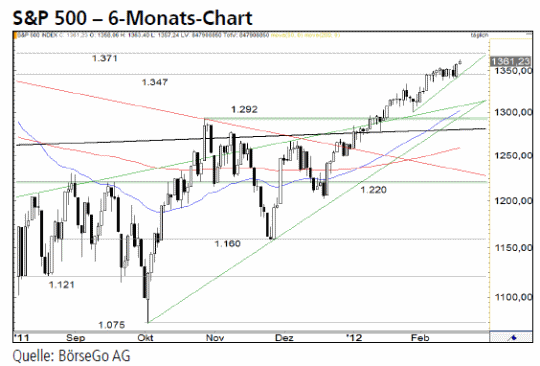 Ausblick: Der Aufwärtstrend des S&P 500 Index geht bereits in den fünften Monat, ein Ende ist nicht in Sicht. Dennoch wird der Index korrekturanfälliger. Die Long-Szenarien: Der S&P 500 Index dürfte weiter gegen 1.371 Punkte ansteigen und dort zu einer Korrektur ansetzen. Diese könnte den Wert bis 1.347 Punkte zurückführen, ohne den Aufwärtstrend zu gefährden. Sollte es dagegen zu einem unmittelbaren Ausbruch über 1.371 Punkte kommen, ist eine weitere mehrtägige Kaufwelle bis 1.415 und 1.425 Punkte wahrscheinlich. Die Short-Szenarien: Sollte der S&P 500 Index allerdings unter die kurzfristige Aufwärtstrendlinie und die Unterstützung bei 1.347 Punkten zurückfallen, wäre dies ein klares Signal für eine deutlichere Korrekturbewegung. In diesem Fall könnte sich eine Gegenbewegung bis 1.325 Punkte vollziehen. Von dort aus könnte sich der Aufwärtstrend fortsetzen. Unterhalb dieser Marke ist jedoch ein Ausverkauf bis an die wichtige Unterstützung bei 1.292 Punkten zu erwarten. Auf diesem Niveau wäre anschliessend mit einer Bodenbildung zu rechnen.