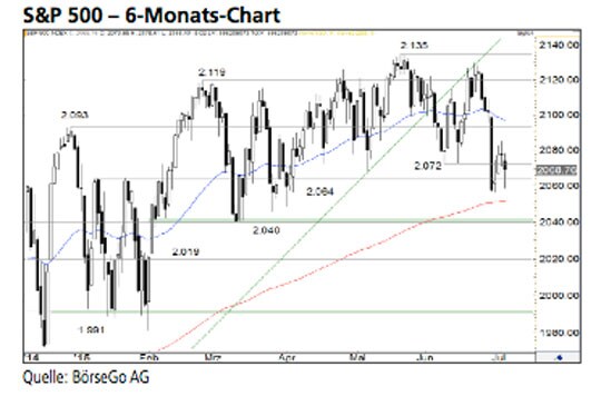 Der Bruch der langfristigen Aufwärtstrendlinie des S&P 500 Index sorgte nach einem neuen Allzeithoch bei 2.135 Punkte ab Mitte Mai für eine schrittweise Eintrübung des Chartbildes.