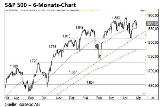 Ausblick: Die positive Umkehr könnte die Basis für weiter steigende Kurse bilden. Voraussetzung hierfür ist allerdings, dass das gestrige Tief nicht mehr deutlich unterschritten wird. Die Long-Szenarien: Kann der S&P 500 Index seine Aufwärtsbewegung weiter fortsetzen und den Widerstand bei 1.883 Punkten hinter sich lassen, dürfte er zügig sein bisheriges Allzeithoch bei 1.897 Punkten ansteuern. Sollte den Bullen auch ein Anstieg über diese Marke gelingen, hätten sie ein neues Kaufsignal aktiviert. Dieses könnte den S&P 500 Index, wie bereits in der Vorwoche erwähnt, zunächst auf 1.910 Punkte und anschliessend auf 1.925 Punkte ansteigen lassen. Die Short- Szenarien: Unterschreitet der Index dagegen die Unterstützung bei 1.849 Punkten, dürfte er noch einmal auf die Marke von 1.813 Punkten zurücksetzen. Hier sollten die Bullen die Notierung schnell wieder auffangen, ansonsten droht ein Test der Unterstützung bei 1.775 Punkten. Dort bestünden allerdings gute Chancen auf eine Stabilisierung.