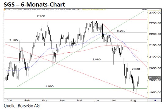 Anfang dieses Jahres gelang den Bullen ein erster Konter, der nach dem Ausbruch über eine mittelfristige Abwärtstrendlinie zu einem Anstieg an die Kurshürde bei 2.266 CHF führte. Diese Marke konnte zunächst nicht durchbrochen werden, wurde jedoch nach einer Zwischenkorrektur im Juni ein zweites Mal angelaufen. Auch diesmal scheiterten die Bullen an der Barriere und die Aktien von SGS kamen in der Folge deutlich unter Druck: Zunächst löste der Bruch der Unterstützung bei 2.163 CHF einen Ausverkauf bis zur Haltemarke bei 2.080 CHF aus und schliesslich wurde die Marke nach einer Erholung im Juli ebenfalls gebrochen. In den vergangenen Wochen setzte sich daraufhin ein steiler Abwärtsimpuls in Gang, der die Aktien von SGS erneut an die 1.960 CHF-Marke einbrechen liess.