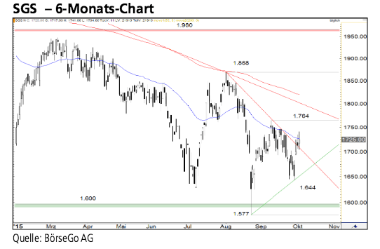 Rückblick: Nach einem steilen bearishen Rücklauf an die 1.960 CHF- Marke kam der Wert bis Anfang Juli wieder unter Druck und setzte an die Unterstützungsregion um 1.600 CHF zurück. Zwar konnten die Bullen den Bereich ein weiteres Mal verteidigen, eine anschliessende Gegenbewegung ebbte jedoch bei 1.868 CHF ab und die Aktien fielen abermals zurück. Dabei sorgte der Bruch der Unterstützung bei 1.764 CHF für eine dramatische Beschleunigung des Einbruchs. Erst knapp unterhalb der 1.600 CHF-Marke wurde dieser gestoppt. Doch mit der Rückeroberung der 1.600 CHF-Marke meldeten sich die Bullen erfolgreich zurück und trieben den Wert zunächst wieder an die Kurshürde bei 1.764 CHF an. Dort kam es Mitte September zu einer Korrektur der Kaufwelle, die von der Käuferseite in der letzten Woche gestoppt wurde. Zuletzt brach der Wert bereits über eine kurzfristige Abwärtstrendlinie aus und generierte damit ein Kaufsignal.